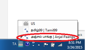 ஊ. மீண்டும் ஆங்கிலத்தில் தட்டச்சு செய்ய கீழ்ப்பட்டையில் தெரியும் கீமேன் விசைப்பலகையை சொடுக்கி "US" ஐ தெரிவு செய்து ஆங்கிலத்தில் தட்டச்சு செய்து கொள்ளலாம்.